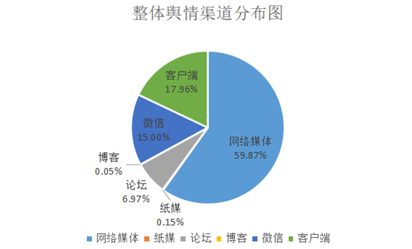 从整体舆情渠道分布来看,主要集中在网络媒体渠道(包含外国媒体),占比59.87%,数据高达337700篇,为传播渠道主要阵地;第二为客户端平台,占比17.96%,共计101284篇;第三为微信平台,占比15%,共计84637;第四为论坛,占比6.97%,共计39319篇。纸媒和博客占比均较低。