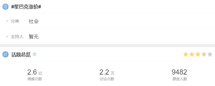 多个媒体自发在微博形成多个话题,其中#星巴克涨价#阅读次数2.6 亿,讨论次数2.2 万,原创人数9482。截至2月28日,24小时热度仍在发酵,同时不少网民联想驱赶警察事件,反感态度尤为明显。详情可见下图: