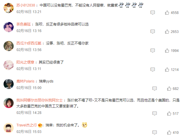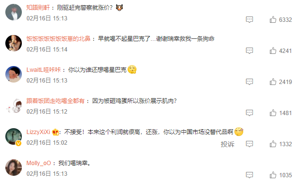 近期星巴克频频上热搜。重庆星巴克“驱赶民警事件”让星巴克直挂在热搜被骂,话题从 #星巴克驱赶执勤民警# ,到 #星巴克发文致歉# ,再到 #星巴克驱赶民警事件相关各方被约谈#。2月16日,#星巴克涨价#话题再次接连登上热搜第一。据网民查询星巴克官方APP时发现,大杯冷萃冰咖啡从36元涨到37元,大杯摩卡从35元涨到36元,大杯美式从28元涨到30元,整体涨价幅度在1-2元。网友表示,“店大欺客”,“以后不会再喝了”。也有网友戏称,星巴克这是在风口浪尖上涨价,进一步加深了“众怒”。