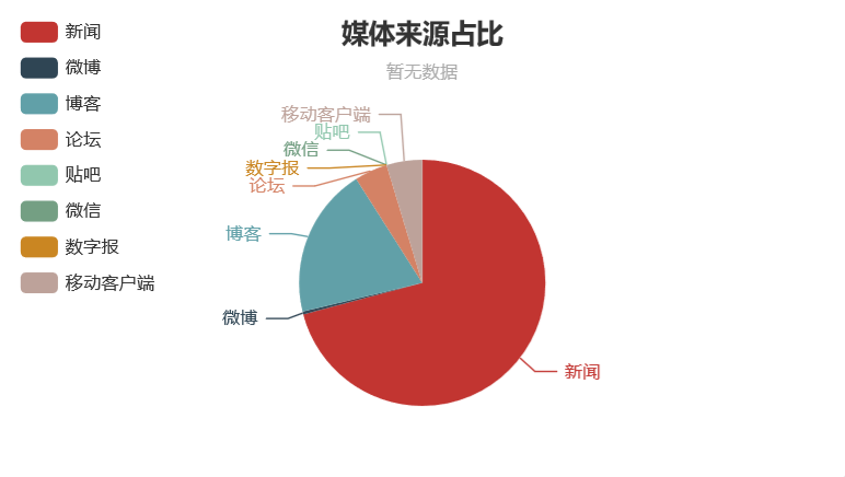 从整体舆情渠道分布来看,主要集中在新闻渠道,占比70.86%,数据达2651篇,为传播渠道主要阵地;第二为博客,占比19.75%,共计739篇;第三为移动客户端,占比4.86%,共计175篇;第四为论坛,占比4.33%,共计162篇。
