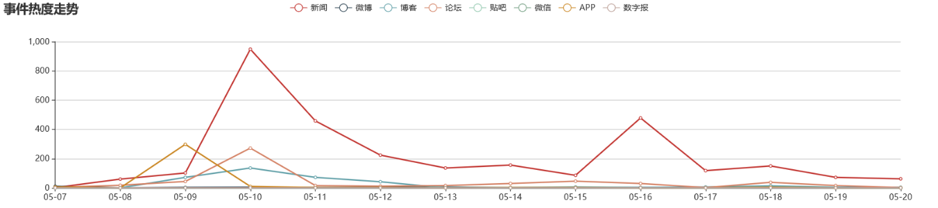 蓝太平洋舆情监测平台对各渠道进行事件热度趋势监测,其中新闻渠道事件热度在5月10日达到最高峰,当日发布相关文章为948篇,之后呈下降趋势,但在5月16日再达到小高峰。 APP渠道和论坛渠道的热度分别在5月9日和5月10日达到最高,之后则呈下降趋势。